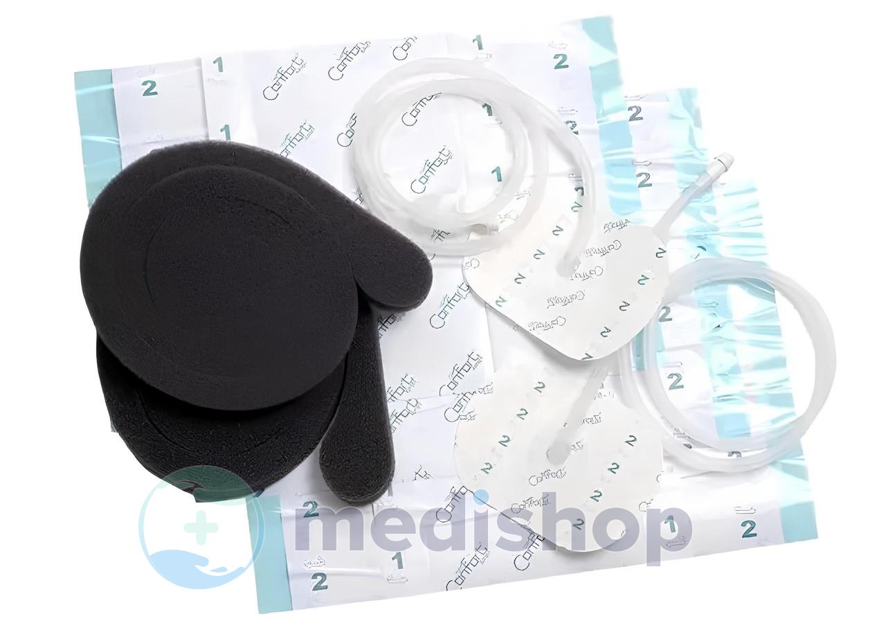 Набір для ВАК насоса Confort поєднує стандартну функції з вакуумом та можливість вводити лікарські засоби одразу в рану Завдяки інтегрованому порталу, цей комплект підходить для значних та заражених мікроорганізмами ран, де потрібне не лише очищення, а й антисептична обробка.