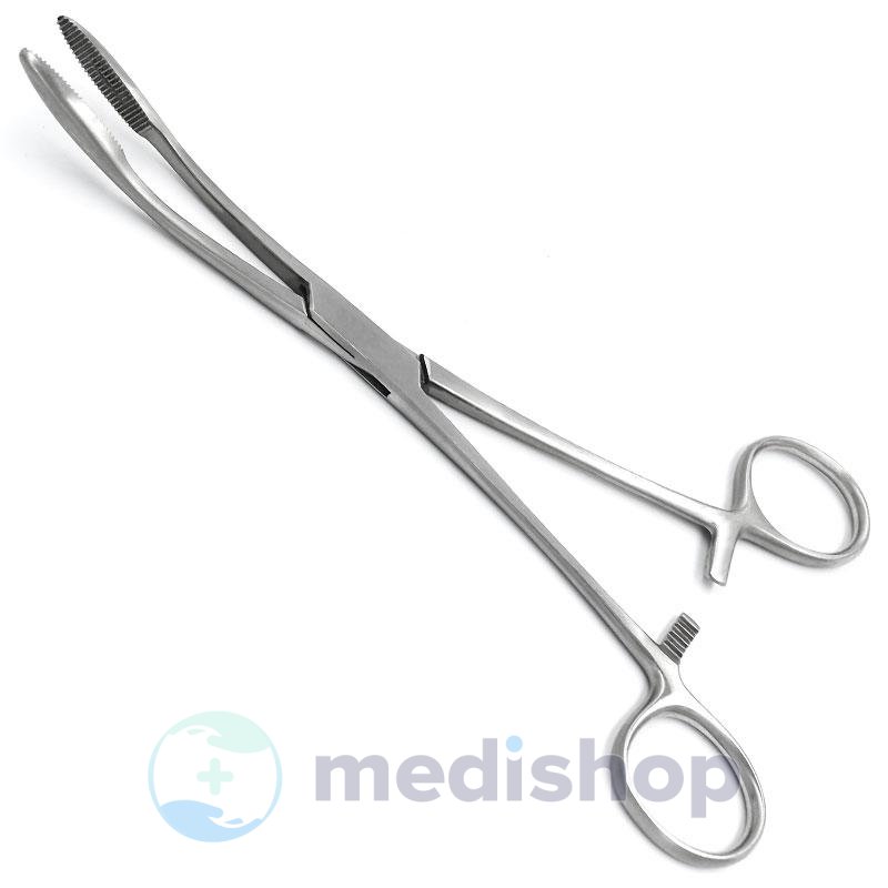 Корнцанг зігнутий, 200 мм Майєра, з кремальєрою