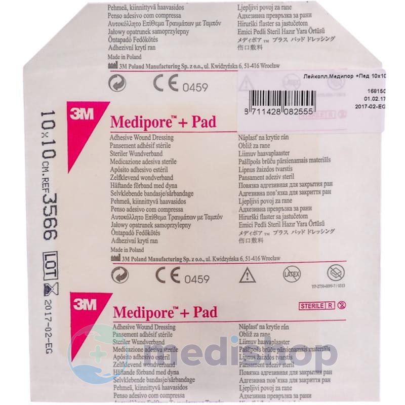 Основная информацияМедицинские, пластырные повязки Медипор +Пед 3M, 10 см - 10 см, 3566E