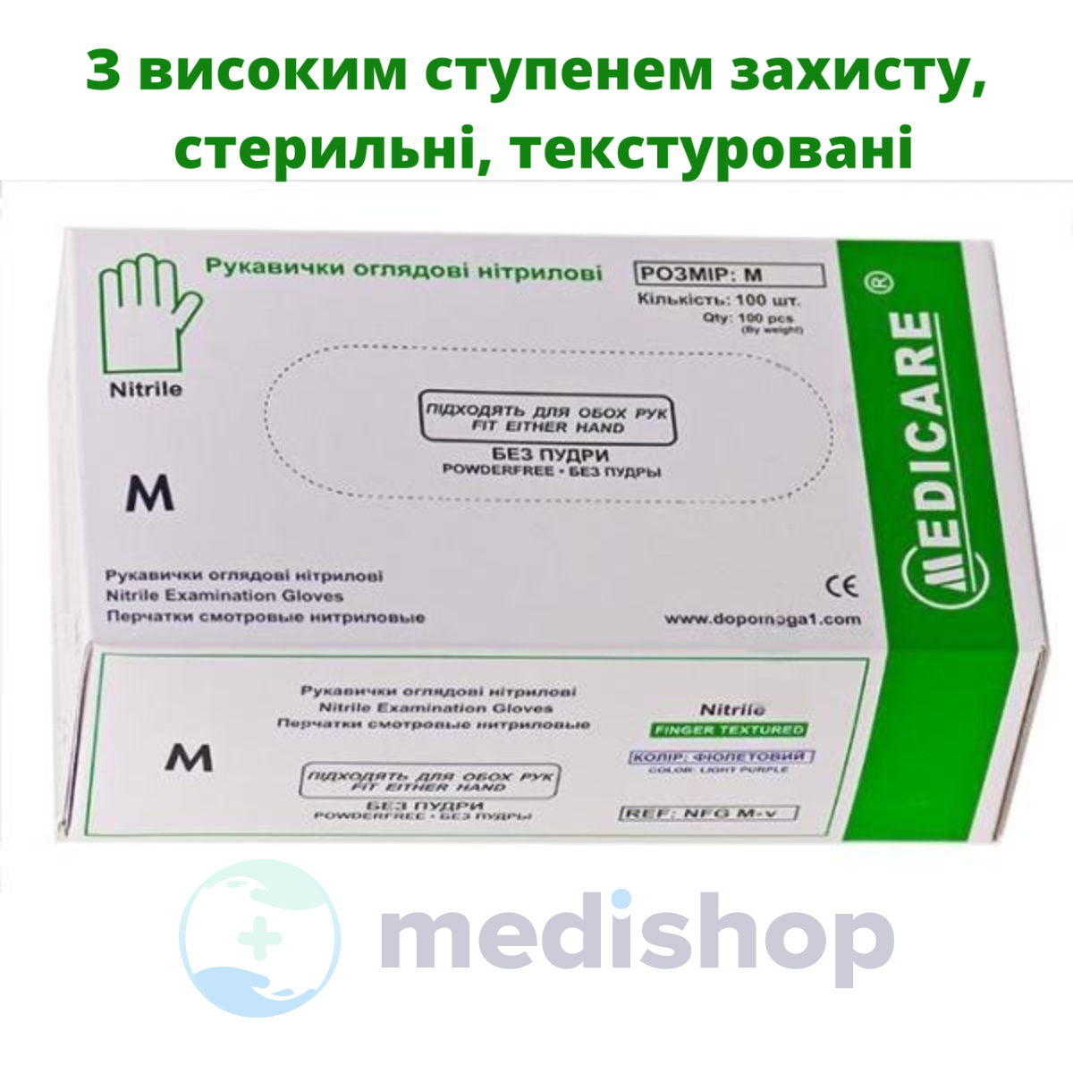 - Рукавички нітрилові Medicare стерильні, підвищеного ризику, текстуровані, без пудри 50 пар, S