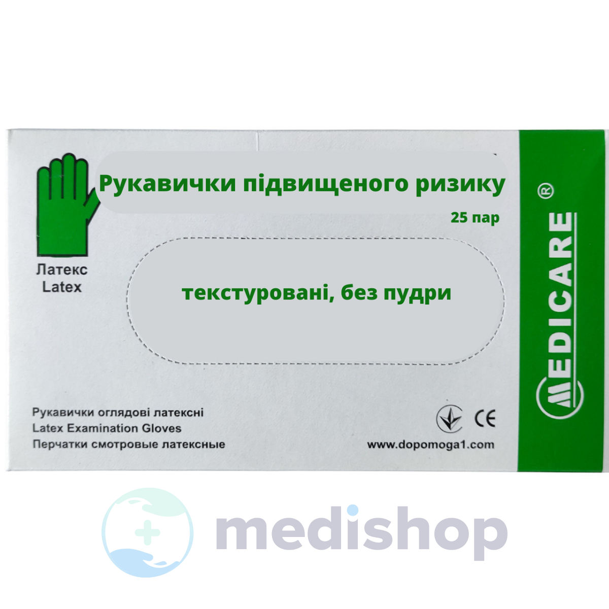 Рукавички латексні Medicare, нестерильні, підвищеного ризику, текстуровані, без пудри, 50 пар, XS